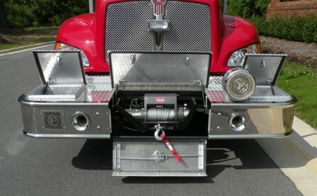 Portable winches that can be operated from front, rear and sides of the apparatus have become very popular. The problem is storage generally consumes a lot of valuable space within the body. Hackney pioneered a solution many years ago with the drop-down front bumper winch access. The portable winch is stored inside the front bumper, but it can also be operated from that location. If required to be relocated to a side or rear receiver, simply disconnect the power cable, pull the receiver pin and take it to another location. Doesn’t get more simple than that. Another innovation from a rescue manufacturer that takes storage capacity seriously and has pioneered this and many other solutions to solve space problems.